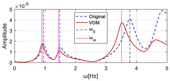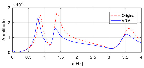 To simulate noise pollution, 5% Gaussian white noise is added to the excitations and responses. If the virtual mass is 4.0 × 104 kg at wheel T1 and 0 kg at wheel T2, the virtual mass matrix can be expressed as . The frequency response of the virtual structure is then obtained by substituting and the Fourier transforms of the excitation and response into Equation (10). The computed acceleration frequency responses at the T1 wheel position are shown in Figure 25 ‘VDM’, and the first three natural frequencies of the structure can be identified as [0.7784, 1.2793, 3.5613] Hz. Similarly, the addition of the virtual mass of 4.0 × 104 kg and 0 kg at position T2 and T1, respectively, results in the virtual mass matrix . The computed acceleration frequency responses at the T2 wheel position are shown in Figure 26, and the identified first three natural frequencies of the virtual structure are [0.78584, 1.30304, 3.47824] Hz.