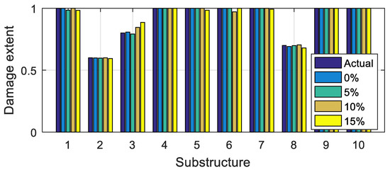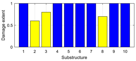 In practice, for complex structures such as bridges, it is generally feasible to divide them into substructures, and to identify the substructural damage. For each substructure, a virtual mass is applied, and then the natural frequencies of the corresponding virtual structures are identified using the structural frequency responses constructed via Equation (11). Denote by as the identified i-th frequency of the virtual structure with the virtual mass applied to the j-th substructure. All identified frequencies are combined to identify the structural damage via the following equation: