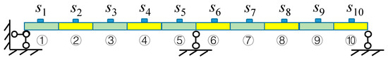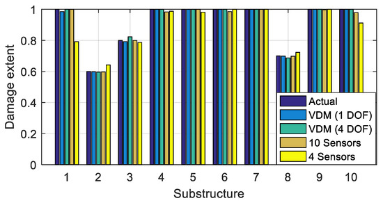 First, all ten sensors S1~S10 are adopted, which yielded results similarly accurate as these of the proposed methodology, see Figure 27 “10 Sensors” and Table 6 (Dir_Ten, Error_ Ten). Then the damages are identified by employing four sensors S2, S4, S7, S9, located in the middle of the corresponding substructures as shown in Figure 28. The identification results are shown in Figure 27 “4 Sensors” and in Table 6 (Dir_Four, Error_ Four). The maximum error is large, i.e., over 20%.