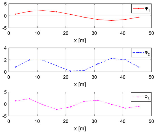 For comparison and in order to verify the advantage of the proposed method, the damages of the considered two-span bridge are also identified directly using structural modal parameters. The free vibration responses under environmental excitation are measured using acceleration sensors located in the middle of the ten substructures, as shown in Figure 28. Gaussian noise at the level of 5% is considered. First, the first three natural frequencies and mode shapes (Figure 29) are identified from the responses. The damages are optimized using the objective function considered in [47] and shown in Equation (20), where is the number of the structural mode shapes and is the number of the natural frequencies, while and are the respective weighting coefficients: