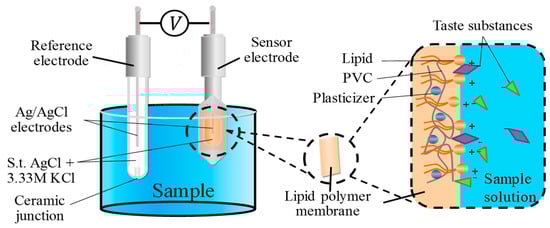 A taste sensor which adopts a lipid polymer membrane as a sensing part was used in this study. The lipid polymer membrane consists of a lipid, plasticizer and PVC []. The membrane can be charged in the solution due to the ionization of the lipid. The lipid content also determines the hydrophobicity of the membrane. The plasticizer is used to adjust the flexibility and hydrophobicity of the membrane. PVC is used as a supporting material. As shown in Figure 1, when the lipid polymer membrane is immersed in solutions, the hydrophilic group of the lipid can be ionized to charge the surface of the membrane [,], and then the lipid polymer membrane can attract the corresponding taste substances in solutions due to the electrostatic interaction and hydrophobic interaction. As a result, the membrane potential changes. Then, the intensity of the taste can be evaluated. In this study, the sweetness sensor for high-potency sweeteners consists of TDAB, NPOE and PVC, which we developed in a previous study []. The saltiness sensor consists of TDAB, TDA, DOPP and PVC [].