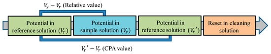 As shown in Figure 2, the following steps are executed when measuring samples. First, sensors were immersed in the reference solution, and the membrane potential between the working electrode and reference electrode was measured as Vr. The composition of the reference solution was 0.3 mM tartaric acid and 30 mM KCl. After moving the sensor into the sample solution, the taste substances were attracted to the sensor membrane surface due to electrostatic interactions and hydrophobic interactions, as mentioned above in Section 2.2. The membrane potential between the electrodes in the sample was Vs. After that, the electrodes were immersed in the reference solution again and gently washed. In this process, hydrophilic substances were washed away, and the membrane potential decreased to Vr′. Finally, the electrodes were cleaned with an alcohol-based cleaning solution. Furthermore, Vs–Vr was defined as the relative value, and Vr′–Vr was defined as the CPA value. CPA stands for a change in the membrane potential caused by adsorption. On the other hand, the relative value was the change of membrane potential caused by both the electrostatic interaction and hydrophobic interaction [,,].