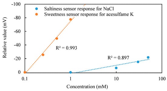 Figure 4 shows the relative values of the sweetness sensor for different concentrations of acesulfame K, and the saltiness sensor for different concentrations of NaCl. Relative values of the sweetness sensor changed in a concentration-dependent manner and can be well approximated with a logarithmic function to the concentration of acesulfame K. Similarly, the relative values of the saltiness sensor also showed a dependence on the concentration of NaCl. Therefore, it is suggested that the logarithmic function can be used to represent the relationship between the relative value and the concentration of taste substances.