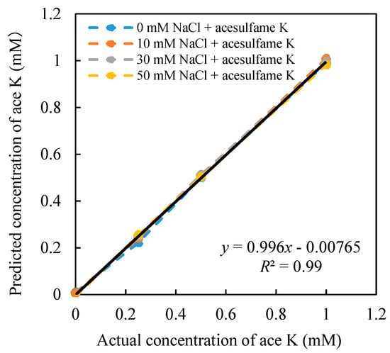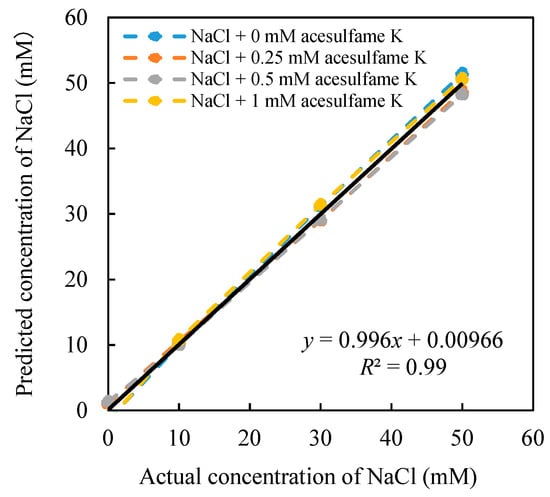 Figure 5 shows the high correlation between the estimated concentration and the actual concentration (R2 = 0.996). When the concentration of NaCl changes from 0–50 mM, the concentration of acesulfame K can be well predicted from 0–1 mM. Meanwhile, when the NaCl concentration changes, it does not affect the prediction of acesulfame K concentration. At the same time, the NaCl concentration can also be estimated simultaneously (Figure 6). The concentration of NaCl (0–50 mM) can be well predicted at different concentrations of acesulfame K (0–1 mM). Therefore, the model we created in this study can effectively predict the concentration of acesulfame K at 0–1 mM in mixed solutions. This analysis model has proved to eliminate the influence of saltiness successfully.