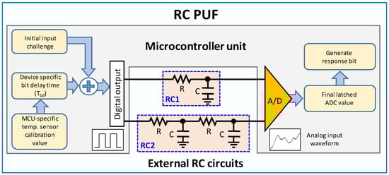 The basic structure of the proposed RC PUF is shown in Figure 1, where the second-order RC circuit (RC2) is newly added to the original RC PUF in [17]. Two types of RC circuits are the simplest form commonly used and were chosen for ease of implementation. Although new circuit has been added, the operation of the proposed RC PUF is same as the original RC PUF in that the RC PUF generates 1-bit response for a challenge consisting of multiple bits. The operation of the RC PUF is following as explained in [17]. At first, the input challenge, which consists of multiple bits, is shifted by 1 bit and the corresponding bit is applied sequentially to the digital output pin such as a general purpose I/O (GPIO). Assuming that the I/O voltage of the MCU is 3.3 V, the voltage applied to the input of the RC circuit will be 3.3 V or ground (GND or 0 V) depending on the value of the output bit. The GPIO output or the input of the RC circuit (RCin) remains constant for a period of time for one bit, which is defined as “bit delay time.” After the bit delay time for one bit has expired, the output changes by the next bit. Accordingly, the output of the RC circuit gradually increases (charging) or decreases (discharging). After all the bits of one challenge bit stream are passed to the GPIO, the final output voltage of the RC circuit (RCout) is sampled by the ADC, and 1-bit response is extracted from the ADC value. We use different GPIO output and ADC input pins for two types of the RC circuit, and only one circuit operates at a time during one challenge sequence so that one circuit does not affect the operation of the other.