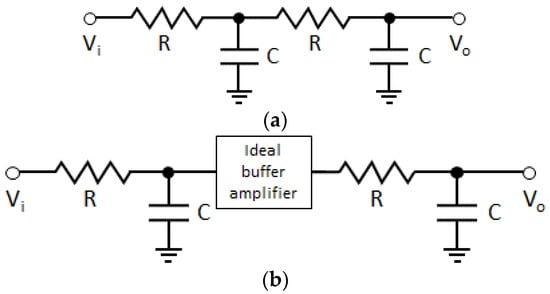 Second-order RC circuit used in RC PUF (a) and with ideal buffer amplifier (b).