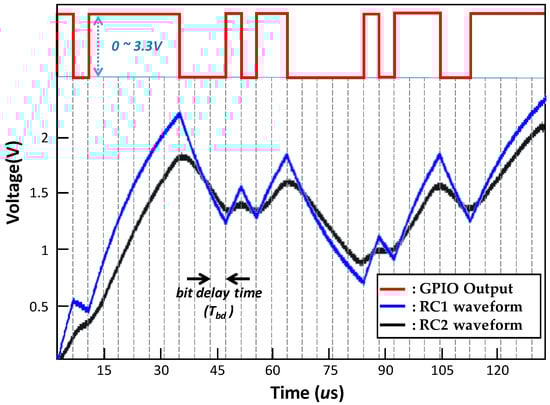Figure 3 shows the experiment waveforms for the first-order RC circuit (RC1) and the second-order RC circuit (RC2). The red line represents the digital (GPIO) output waveform of the RC PUF to run both RC1 and RC2. We applied an arbitrary 32-bit challenge shown at the top of the figure. The resistance and capacitance of the RC circuit are R = 100 kΩ and C = 200 pF, respectively. The maximum input voltage to the RC circuit is = 3.3 V and the bit delay time is about 4.3 us.