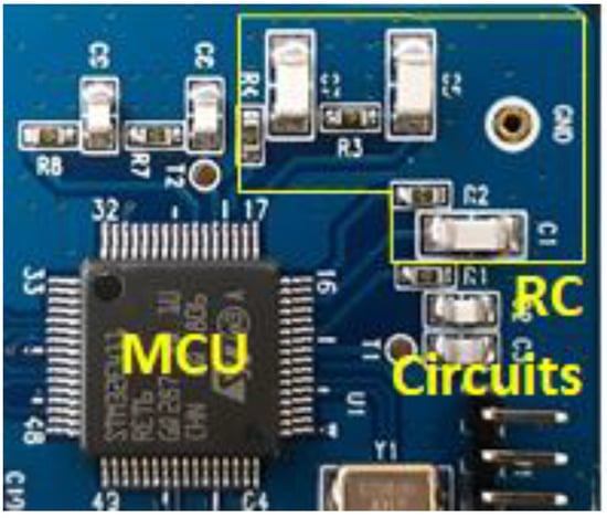 In the proposed RC PUF, we exploit commonly used thin film resistors and multilayer ceramic capacitors (MLCCs) for the RC circuit. We use class 1 (C0G) capacitors with a 20% tolerance for the capacitor of RC circuits. Class 1 capacitors are generally more robust to temperature variation and aging than class 2 or class 3 capacitors [20,21,22]. Then, we choose a resistor with a tolerance of 1% and a good temperature coefficient of 25 ppm for the RC circuit [23]. The selected resistor and capacitor can be easily purchased for less than a few cents. Therefore, the RC PUF can be implemented at a lower cost than other PUFs implemented as separate chips or built into SoCs. In addition, the RC circuit is separate from the microcontroller, providing design flexibility because there is no need to use a specific chip with a built-in PUF.