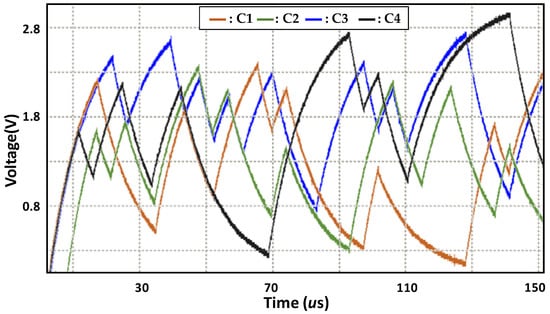 Finally, we compare RC PUF waveforms for different challenges. We run the RC PUF using RC1 on one RC PUF board for four randomly selected 32-bit challenges (C1~C4), as shown in Figure 5. It is observed that different challenge patterns exhibit different waveforms, resulting in a significant difference in the sampled ADC value.