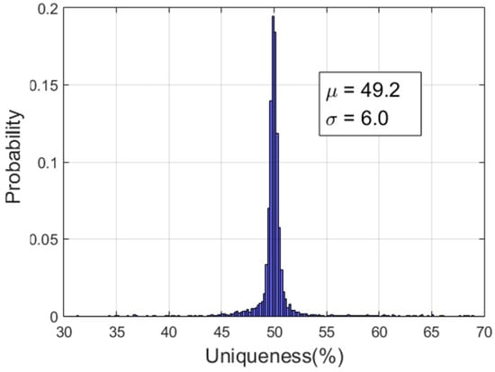 The bit delay time also affects the uniqueness characteristics of the RC PUF. In the fixed mode, when the bit delay time is 2 us, the uniqueness value of RC2 is 1.5% higher than that of RC1, but when 32 us, the uniqueness value of RC1 and RC2 becomes similar within 0.2%. In VD4 and VD5 modes, the uniqueness values of RC2 are 0.3% to 0.4% higher than those of RC1. We think that because RC2 uses more RC components than RC1, it is more affected by the accumulation of tolerance values of these components and the parasitic resistance and capacitance on the board. Figure 6 shows the uniqueness characteristic of RC2 in VD5 mode.