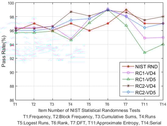 For the selected subset, we performed the test using VD4 and VD5 bit delays for both RC1 and RC2, and the 1,048,576 response bits were generated using randomly selected challenges for each of the 100 RC PUFs. The results of all test suites were tested using the response of each RC PUF, and the final results were expressed as the average of 100 RC PUFs. As shown in Figure 7, the pass rates for all combinations are higher than 90%, and RC2 combinations of RC2-VD4 and RC2-VD5 show similar pass rates compared to the NIST recommended random data (NIST RND) [30]. Any bit bias for the entire bit strings of the PUF output can be checked using T1, T2 or T3 [11], which exhibits pass rates >0.95 for all combinations. However, the result of T4 shows that RC1 has more consecutive 1′s or 0′s than RC2. In addition, T11 and T14 show that RC2 has better irregularity characteristics for overlapping patterns than RC1. More specifically, two RC PUFs showed below 15% pass rate in T11 for VD5 mode in RC1. Their response includes bit strings with similar bit patterns, such as “…1100000000110000…” or “…0011000110001100…”, resulting in relatively low pass rates. In addition, since one response bit is generated from one random challenge, it is difficult to physically explain why similar bit patterns are generated, and it is unclear whether it is caused by structural differences between RC1 and RC2. Nevertheless, the results of all NIST test suites for the RC PUF in Figure 7 show that RC2 has better randomness characteristics than RC1, and further analysis is required using more samples.
