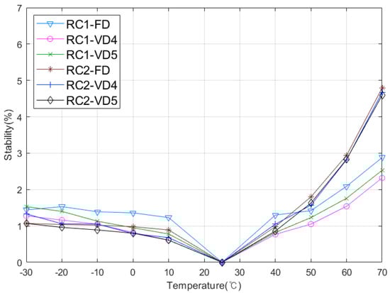 First, to evaluate the stability to temperature variations, the RC PUF boards were placed on a temperature chamber, as shown in Figure 8, and the temperature was increased by 10 °C from –30 °C to 70 °C. Figure 9 shows that the stabilities of both RC1 and RC2 are maintained within 2% at temperatures below 50 °C, but increases above 50 °C, as shown in Figure 9. More specifically, RC1 exhibits less than 3% stability over the entire range, but the stability of RC2 increases by 5% above 50 °C. We think that this difference is due to the number of resistors used in the RC circuits. As explained earlier, we exploit class 1 (C0G) capacitors, which are robust to temperature variation and aging, while the resistors used in RC circuits are commonly used thin film resistors with slightly different characteristics over temperature changes. Two thin film resistors are used in RC2, increasing the error rate at higher temperatures. Although the stability increases above 50 °C, the worst case 5% stability on the RC2 is an acceptable error rate that can be recovered using commonly used error correction codes [6].