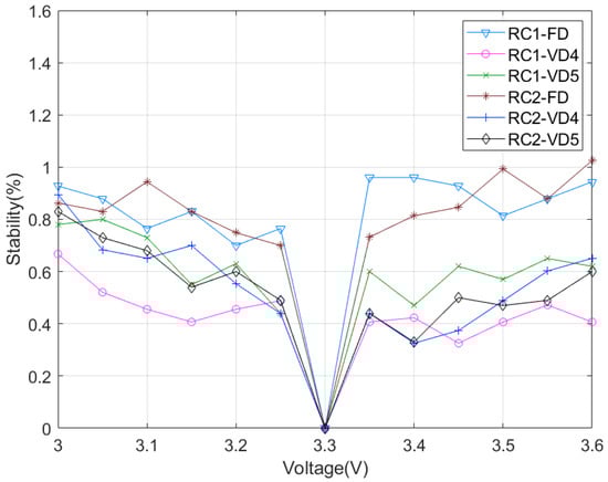 Next, the stability to voltage changes was measured in 0.05 V steps over a voltage range of 3.0~3.6 V. Figure 10 reveals less than 1% stability over the entire range for both RC1 and RC2, which corresponds to a bit flip of less than 10 bits of 1024 bits. The main reason that the RC PUF is robust to voltage variations is because the power supply voltage of the MCU is equal to both the output voltage of the GPIO used as the input voltage of the RC circuit and the operating voltage of the ADC. Therefore, the ADC value is determined by the voltage change ratio, not the absolute voltage.