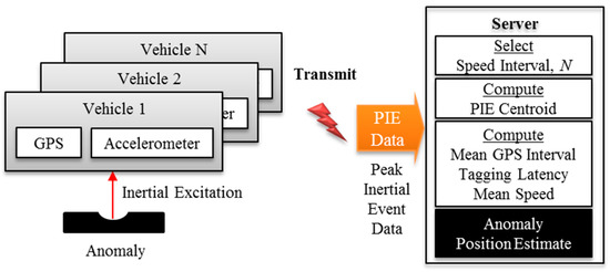 The main contribution of this work is a method to estimate the position of an anomaly from a hotspot of the low-accuracy and low-resolution GPS coordinates of the associated PIE detected. Previous work addressed the complementary problem of anomaly detection by using the participatory sensing approach to enhance signal quality [23]. That is, anomaly detection must occur before estimating its position. This paper addresses the latter. The experiments conducted showed that it is possible to achieve sub-meter localization accuracy from participatory sensors by knowing only the mean GPS update rate, the mean traversal speed, and the mean latency of tagging accelerometer samples with GPS coordinates. Figure 2 is a graphical abstract of the approach. An additional pavement management application (not shown) is needed for a complete solution to inform regular road maintenance. For example, the anomaly position estimate software can feed its output to existing pavement management systems that require the positions of anomalies as inputs.