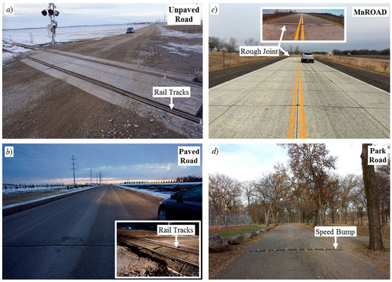 The isolated roughness generator produced a PIE that was easy to detect accurately within the accelerometer signal sample stream. Figure 3 shows the nature of each environment and their isolated roughness generators. Figure 3a,b shows the rail-grade crossings that generated the PIEs for the Unpaved Road and Paved Road traversals, respectively. The inset of Figure 3c displays the rough joint between the asphalt and concrete pavements that generated the PIEs of the MnROAD traversals. Figure 3d shows the speed bump that produced the PIEs of the Park Road traversals.