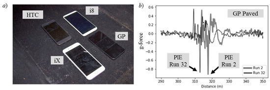 Figure 4b plots a portion of the accelerometer signal from the GP smartphone that contained the PIEs from runs two and 32 of the Paved Road traversals. The distance label on the horizontal axis is the interpolated distance from a common geospatial reference line C0 that bisects the traversal path. The interpolated distance is