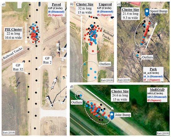 Figure 5 shows the relative geospatial positions of the PIEs from all traversals of each roughness generator. Each circle, diamond, or square shown in Figure 5 represents a PIE from the traversals of one device or experiment as indicated. The insets label the dimensions of the elliptically shaped PIE clusters. The outliers are indicated within the circular boundaries. Table 3 summarizes the values of the various parameters derived from the experiments.