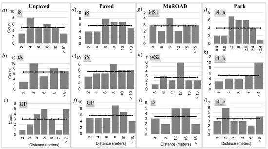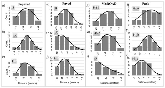 Table 3 lists the p-values from the chi-squared goodness-of-fit tests of the DGT distribution for a normal distribution. The null hypothesis is that the distributions follow a normal distribution. None of the tests could reject the hypothesis that the GPS distance error is normally distributed because the p-values for all experiments were greater than the standard significance of 0.05. This suggests that the alternative hypothesis could be accepted. It is difficult to observe visually that some of the distributions follow a normal distribution because of their large negative bias and large skew. The average GPS resolution gap time TRES was 0.55 s with a standard deviation of 0.05 s. The GPS resolution gap distance was computed from Equation (3), and Figure 7 shows the distribution of those distances for each experiment.