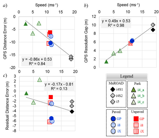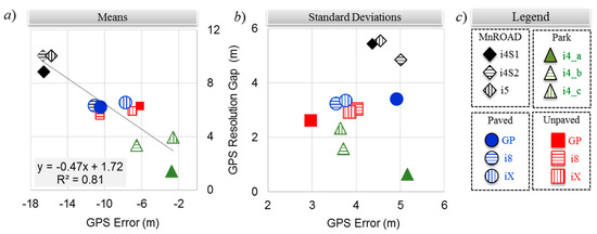 Figure 8a,b compares the means and standard deviations of the GPS distance error and the GPS resolution gap distances, respectively. The legend of Figure 8c helps with visualizing the error patterns among the smartphones in the four experiment environments. The mean errors tended to cluster with speed. From Table 3, the mean speeds were approximately 19, 11, and 5 m∙s−1 for the MnROAD, Paved/Unpaved, and Park Road experiments, respectively. Although three smartphones were in the same spot for the MnROAD, Paved, and Unpaved Road experiments, the difference in their mean errors ranged from less than 1 m to more than 4 m. Except for the highest and lowest speed traversals, the mean GPS resolution gap distance was consistent among smartphones.