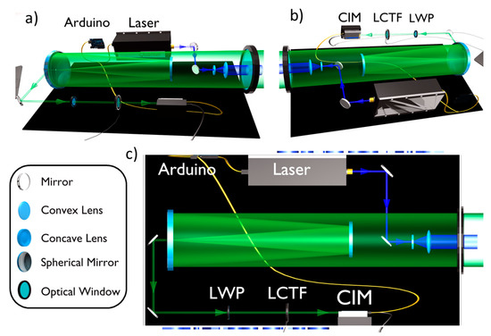 Hyperspectral LIDAR fluorosensor with its components. The excitation light emitted by the laser is sent through a Galilean beam expander to the target. The LIF signal is collected by a Cassegrain collection optics configuration and detected by a LCTF coupled with a CIM unit.