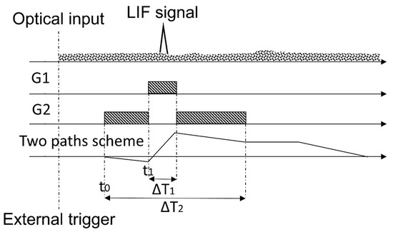 where t0 is the start time of gate G1, m is a constant term (), is the initial time of G2 gate (which contains the LIF signal). Integrating Equation (2), with the assumption that the background signal B1 has a nearly constant amplitude during , we obtain QPMT as in Equation (3). It is worth noticing that the choice made for m makes the term inside the square bracket of Equation (3) vanish, so that the background has null net contribution regardless from the background amplitude. This new proposed method allows that the smart gate and gain definition remove automatically the background contributions from the LIF signal measurement, i.e., . As a consequence, a suitable selection of temporal intervals allows to automatically remove the background contributions simultaneously to the LIF signal measurement.