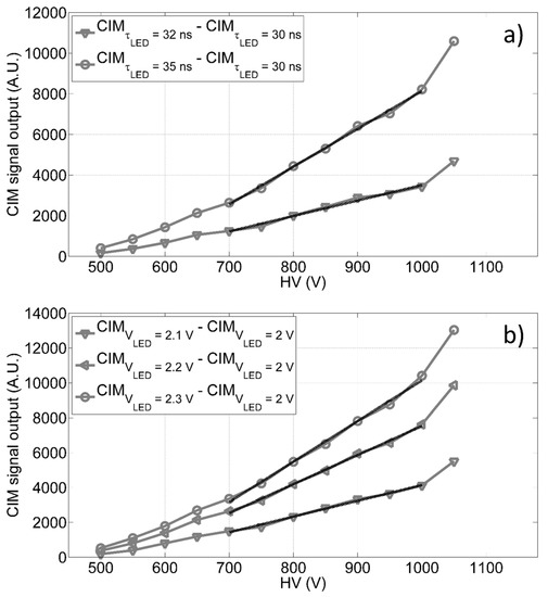 CIM differential output as function of the anode to cathode voltage in diverse conditions: (a) difference between the CIM output measured at 35 ns and 32 ns of pulse widths and the reference signal measured at 30 ns with constant pulse amplitude; (b) difference between the CIM output at 2.1 V, 2.2 V and 2.3 V of LED pulse amplitudes and the reference signal observed at 2.0 V with constant pulse width.
