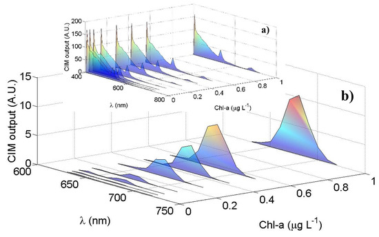 The sensitivity of the CIM unit has been analyzed in different background conditions, studying its signal output as a function of the variable LED light pulse. The background variation has been simulated using a second continuous LED supplied with different current levels. We found that, as the background increases, the sensitivity of the CIM unit decreases (shown in Figure A4). Finally, the differential linearity of the CIM unit in several environmental conditions has been evaluated by laboratory tests based on the finite-difference method [21]. The results are described in Appendix D. The CIM unit has been successfully employed in previous configurations of LIDAR fluorosensor built by the ENEA and operated in many Arctic and Antarctic campaigns to monitor, for example, CDOM and Chl-a concentrations off Svalbard [22] and oil spill in the Mediterranean Sea [23].