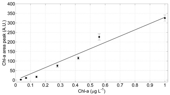 To verify the linearity of the optical sensor, the areas under the mean curve in Figure 6b have been numerically calculated and plotted as a function of the Chl-a concentrations (Figure 7); a linear regression model has been applied. The error bars in Figure 7 have been evaluated as the maximum variation of the fitted areas within the samples acquired for each wavelength. Applying linear regression models to these data and evaluating the t-Student critical values (t), we found that the intercept is not significantly different from zero: the calculated t, in fact, is lower than the corresponding one found in the tabulate t-distribution with a significance level of 0.05. Consequently, we applied to the measured data a linear regression model with null intercept: the estimated coefficients of this model with relative standard error (SE) and the statistical parameters employed to estimate the goodness of the evaluated fit are listed in Table 2.