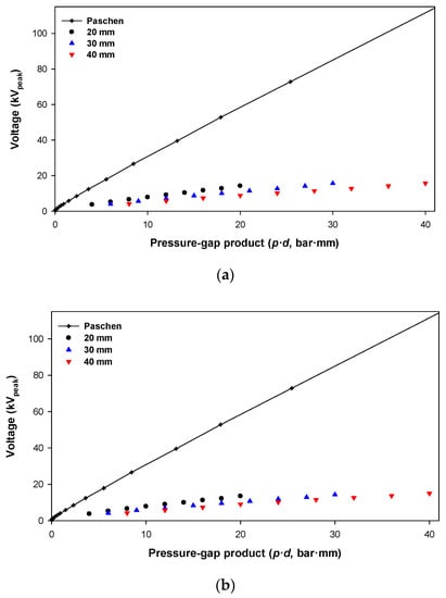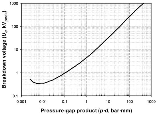Paschen’s law is of great interest for understanding the constitutive processes in gases and, in particular, for atmospheric air, since it is the insulating medium for most high-voltage applications. This law establishes that the breakdown voltage of a gaseous gap depends on the p·d product within the gap (p being the pressure and d the gap length) instead of p and d separately [,]. When dealing with uniform field gaps, there exists only one curve relating Ub and the p·d product. However, other authors have shown that Ub increases with the gap length, even assuming equal values of p·d. Therefore, Paschen’s curves for non-uniform gaps with different gap spacing d are not superimposed and, instead, they are separately spaced so that the breakdown voltage Ub should be expressed as Ub = f(p,d) instead of Ub = f(p·d) [].