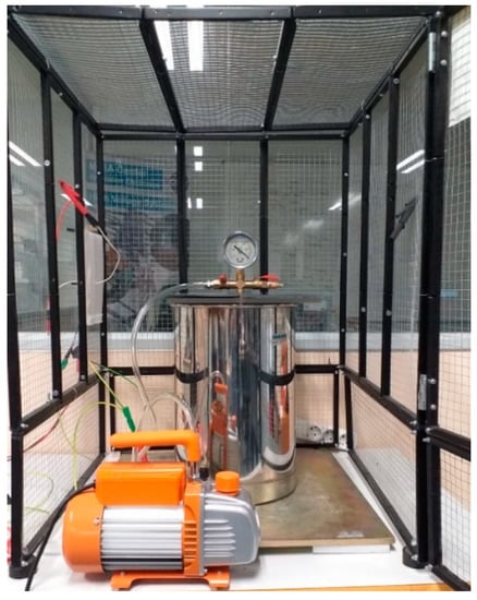 A one-stage vacuum pump model Bacoeng BA-1, allowing a free air displacement of 3.6 cubic feet per minute and an ultimate vacuum pressure of 0.8 Pa was used to lower the pressure inside the vacuum chamber.