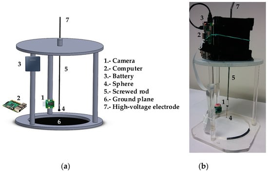 To easily change the gap distance, a special plastic structure was manufactured, which is shown in Figure 4. The stainless steel sphere is attached to a 4 mm screwed rod which allows adjusting the gap distance between the bottom of the sphere and the flat ground plane. Both the sphere and the plane are made of stainless steel. The plastic structure also holds the CMOS imaging sensor, the small single-board raspberry pi computer, and the battery pack used to power both the camera and the raspberry pi, which is wirelessly connected to an external computer which receives the data.