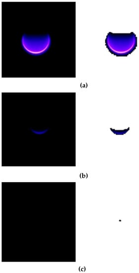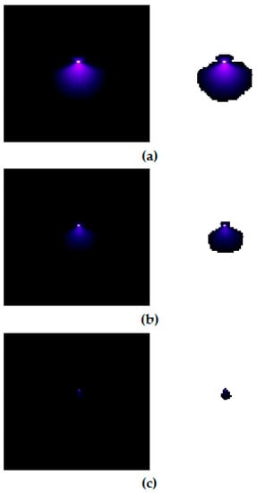Corona photographs under positive DC supply, air gap = 30 mm, 50 kPa. (a) 14.2 kV; (b) 8.6 kV; (c) Corona extinction voltage, 8.4 kV.