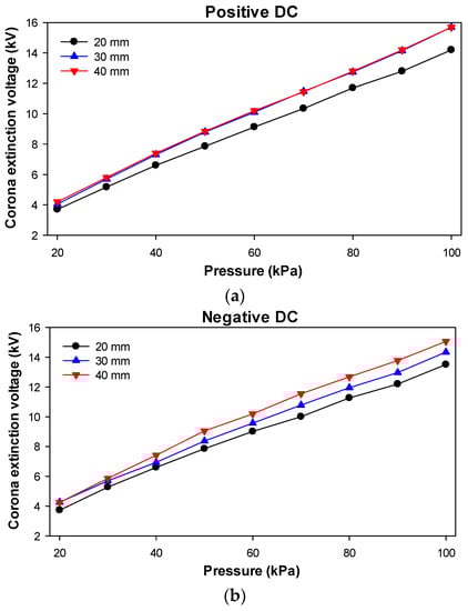 Corona extinction voltage (CEV) values versus air pressure. (a) Positive DC supply; (b) Negative DC supply.