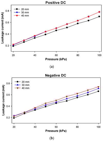 Leakage current versus air pressure. (a) Positive DC supply; (b) Negative DC supply.