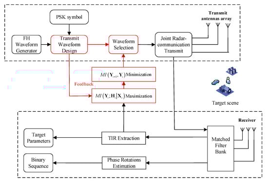 Step 1. Waveform Design: this part includes the design of the FH waveform for the individual MIMO transmit antennas. The primary goal is to maximize the MI between the target-scattering signal and the estimated target response. The method ensures that the target-scattering signal at each time instant is dependent on the target response.
