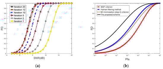Figure 4a illustrates the detection probability offered by the proposed scheme versus the signal-to-noise ratio (SNR) for different iterations. The iteration process is run 20 times. All optimal waveforms are generated by the proposed two-step algorithm. The value of requested SNR increases as the probability increase for a particular number of iterations. The SNR decreases as the number of iterations increase for a certain detection probability. The detection performance offered by the proposed scheme improves as the number of iterations increases. Simulation results show that, on average, 20 iterations of the waveform optimization algorithm are required in order to achieve convergence of the target response estimation for a wide range of radar scenes.