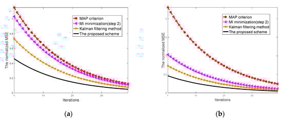 Figure 5a displays the MSE achieved by the proposed scheme with regard to the estimation of target response. This plot demonstrates an improved MSE performance for the two-step optimization as compared with the conventional MAP approach, the Kalman filtering method and the MI optimization (step 2) modules, particularly for the first few iterations.
