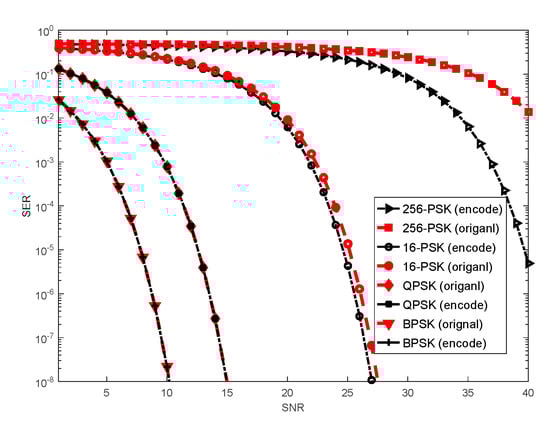 We study the SER performance of the communication source embedding scheme using Binary Phase Shift Keying (BPSK), Quadrature Phase Shift Keying (QPSK), 16-Phase Shift Keying (16-PSK) and 256-Phase Shift Keying (256-PSK) constellations and compare the original waveform with the encoded waveform. The original waveform corresponds to data rate of