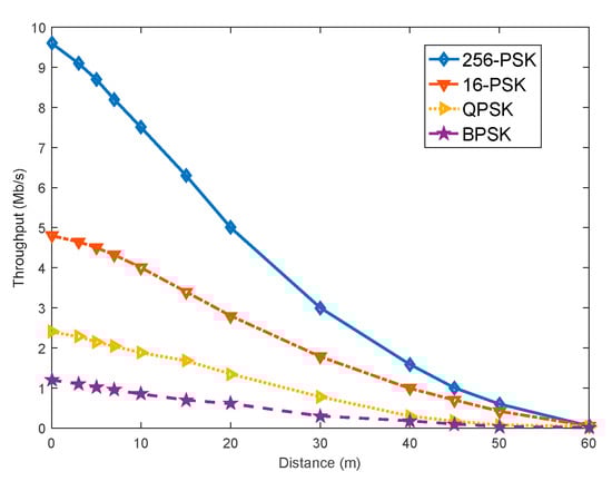 Figure 8 illustrates the throughput result provided by the proposed optimization waveform versus distance for BPSK, QPSK, 16-PSK, and 256-PSK constellation. 256-PSK waveform provides a data rate of approximately 8 Mbps at a distance of 10 m, which is better than that generated by BPSK, QPSK, 16-PSK constellations. The highest data rate is acquired by the 256-PSK waveform within a distance of 60 m, as the distance between the system nodes increases the data rate decreases.