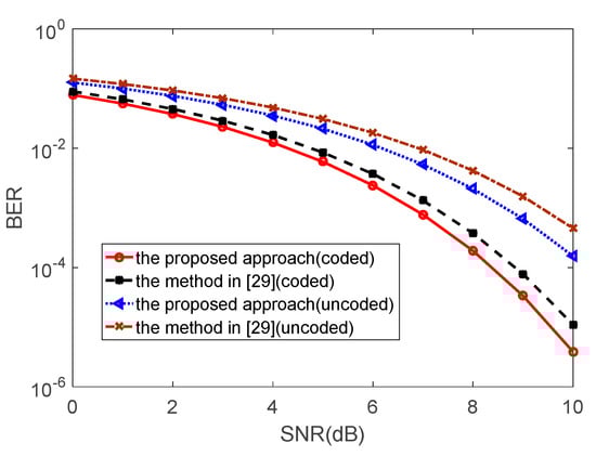 Figure 10 for both the unencoded as well as the encoded data sequences. Obviously, the proposed approach achieves better BER performance compared to the method of [