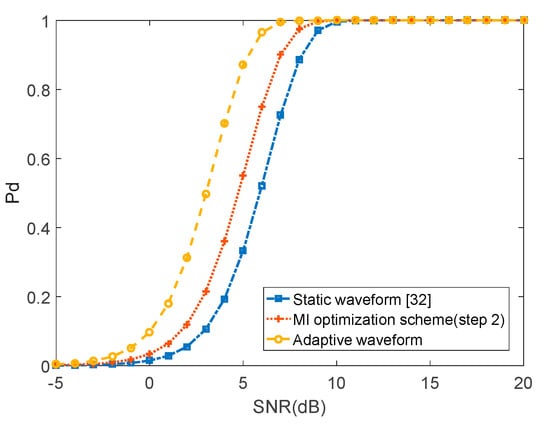 The detection performance is enhanced by providing the waveform design (step 1) procedure in the proposed scheme. The waveform design procedure ensures the maximum of the Euclidean distance between the target echoes from different scatterers based on the MI maximization criterion in (30). The proposed design procedure is similar to the optimization method in [