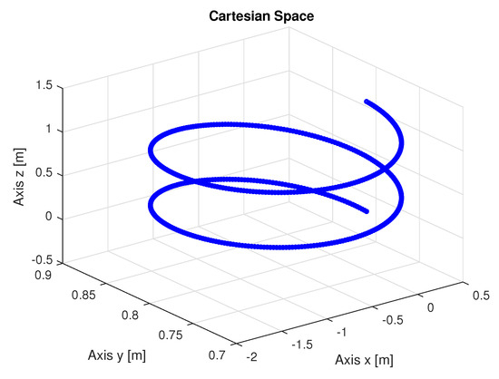 To perform the manipulator trajectory, an algorithm describing a trajectory shown in Figure 5 was developed where the displacement of each manipulator joint in the cartesian space is performed. This trajectory provides the final manipulator positions collected from the encoders of each manipulator joint that were used as inputs to the algorithms that perform inverse kinematic identification.