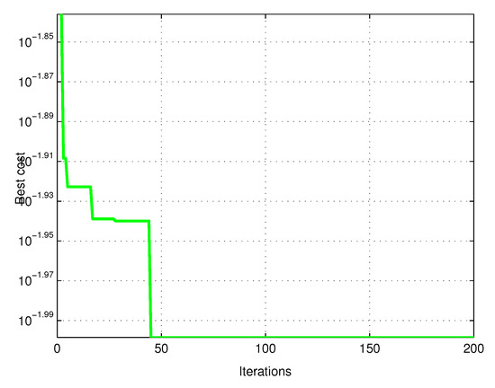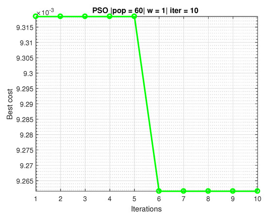 The stopping criterion used in the PSO algorithm was the number of iterations of the algorithm. The PSO metaheuristic has as its mission to minimize the objective function given in Equation (28), with the number of iterations equal to 10, and the algorithm was executed 10 times for obtaining the best result.