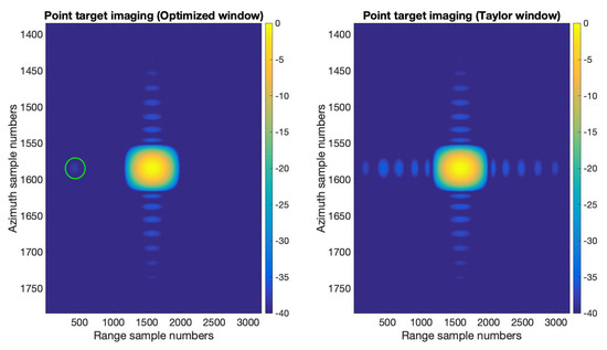 We provide the results of applying the optimized window function obtained in the previous section to SAR imaging in this section. A two-targets scene with highly varied strength was set to verify the effectiveness of the optimized window function. A strong target was placed on the center of the scene, and a weak target was placed on the left side of the center with the same azimuth location. The Radar Cross-Section (RCS) difference of the two point targets was . The range-Doppler algorithm introduced in [30] was used for SAR imaging here. We realized this SAR point targets imaging simulation with two different sets of window functions. The first one is applying the optimized window function obtained in Section 3.1 in range and applying the Taylor window () function in azimuth, and the second one is applying the Taylor window () function both in range and azimuth. The remaining settings in this point target simulation are exactly the same. The imaging results are shown in Figure 9 and Figure 10. Figure 9 gives the interpolated plots of the point targets. In the optimized window case, we can see the weak target in the green circle shown in Figure 9, while in the Taylor window case, the weak target is buried in the sidelobe of the strong target. Figure 10 shows the range and azimuth profiles of the strong target. We can see in the range profile that the optimized window clearly displays a weak target on the left of the strong target. The azimuth profile of the optimized window and the Taylor window are the same. These SAR point target imaging simulation results have verified the effectiveness of the optimized window in this paper.