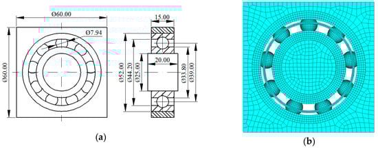 In constructing the FEM model of the bearing, 3D solid element (SOLID164) and shell element (SHELL163) are employed to mesh the body and inner surface of inner ring (for applying the rotating loading), respectively. In order to reduce the computing time and improve the calculation accuracy, the element size is changed according to the components of bearing, as shown in Table 2. Figure 2b shows the result of meshing, and the total FEM model contains 71,976 elements with 73,133 nodes. All the components of bearing are constructed with line elastic material: density ρ = 7860 kg/m3, elastic modulus E = 2.06 × 10 Pa, and Poisson’s ratio μ = 0.3.