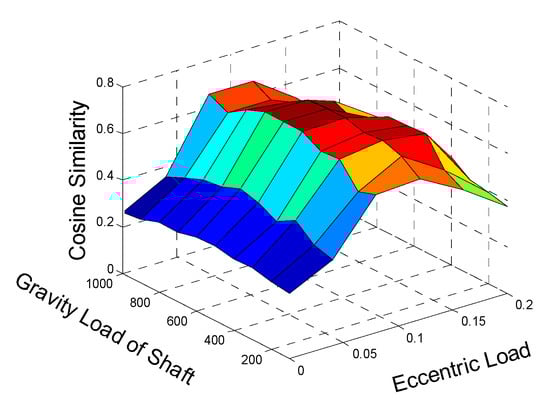 However, the loads of bearing are unknown, include the gravity load of shaft Fg, the eccentric load caused by machining error Fe, and the preload of inner ring Fro, which are the main factors affecting the vibration response of the bearing. Therefore, the three loads are the sensitive parameters to be updated using the cosine similarity cos(θ). Referring to the rotating load of bearing in the actual experiment, the rotating speed n = 1797 rpm is applied to the inner surface of the inner ring. Fg is preliminary set in the range from 100 N to 1000 N. Meanwhile, Fe is applied to the upper surface of inner ring. According to the general coaxiality requirement of a shaft, the maximum eccentric distance of the shaft is limited to 0.01 mm. Then Fe is accordingly updated in the range of 0 to 0.2 MPa. Moreover, Fi is applied on the inner surface of the inner ring to make each ball fully contact with the raceway. According to Reference [], the radial preload of inner ring Fao can be calculated: