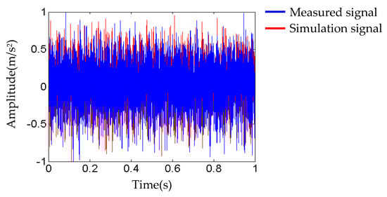 Through iteratively adjusting the selected load parameters (Fg, Fe, and Fro) according to the flowchart shown in Figure 1, we finally obtain the maximum cosine similarity cos(θ) = 0.618. The changing trend of cosine similarity values are shown in Table 4 and Figure 3. Figure 4 shows the comparison between measured and simulated signals when cos(θ) = 0.618. The two signals are matched well at a certain degree, which proves that the updated FEM model constructed using the relative optimal parameters (shown in Table 3) is agreeable.