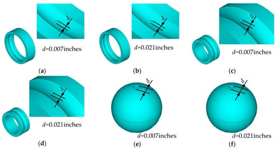 The geometry of faulty bearing: (a) Fault type T1; (b) Fault type T2; (c) Fault type T3; (d) Fault type T4; (e) Fault type T5; and (f) Fault type T6.