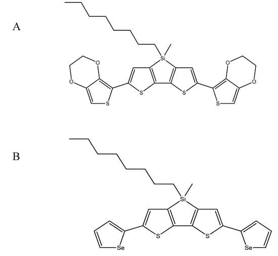 Structure of 2,6-bis(3,4-ethylenedioxythiophen-5-yl)-4-methyl-4-octyl-dithienosilole (A) and 2,6-bis(selenophen-2-yl)-4-methyl-4-octyl-dithienosilole (B).