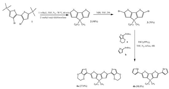 Structure of synthesized monomers is shown on Figure 1. The synthesis of 2,6-bis(3,4-ethylenedioxythiophen-5-yl)-4-methyl-4-octyl-dithienosilole (4a, see Figure 2) and 2,6-bis(selenophen-2-yl)-4-methyl-4-octyl-dithienosilole (4b, see Figure 2) was based on the Stille reaction, i.e., coupling of the organotin compound (a or b, see Figure 2) with the organic halide (3, see Figure 2) catalyzed by the palladium complexes (PdCl2(PPh3)2). The reaction was carried out under nitrogen at 55 °C for 48 h and the medium was anhydrous tetrahydrofuran (THF). The reaction scheme is shown in Figure 2 (entire synthesis process, according to the data []).
